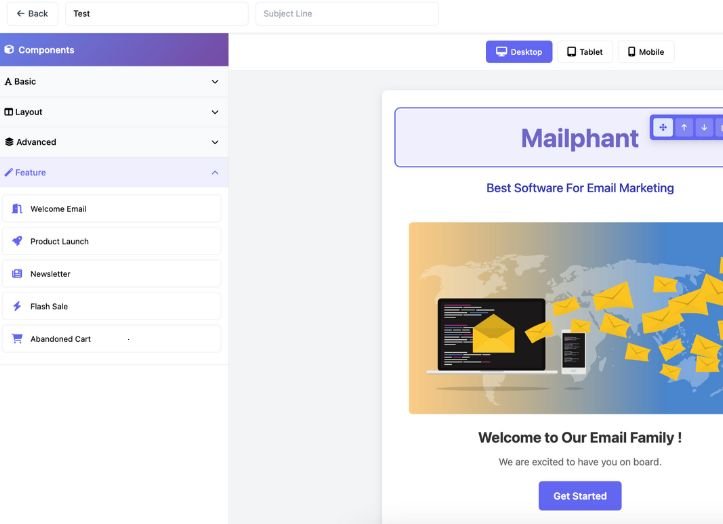 Create professional email marketing campaigns without writing a single line of code. Mailphant’s drag and drop email editor lets you design, edit, and launch campaigns quickly using a simple visual interface.